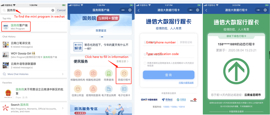 Method 2: Search the "The State Council – 国务院" from the WeChat applet then find "Epidemic Prevention and Control Procedure Card – 防疫行程卡" to fill in. (please see above sketch map)