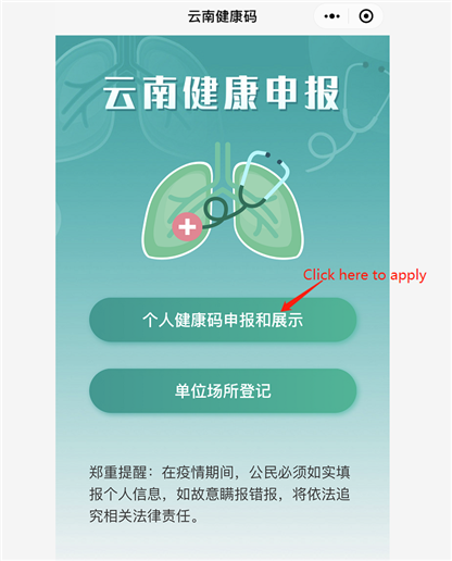 Method 2: Search the "Yunnan Health Code – 云南健康码" from the WeChat applet then click the "Personal Health Code Declaration and Display Button – 个人健康码申报和展示" to fill in. (please see above sketch map)